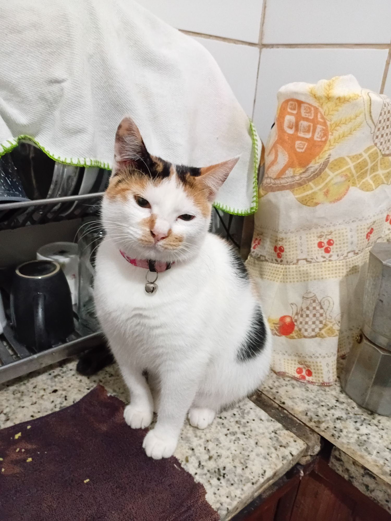 Gata Branca com manchas de cor preta e marrom, ela sumiu sexta 19/12 para sábado 20/12, provavelmente durante a madrugada, só encontrei sua coleira perto da minha casa!